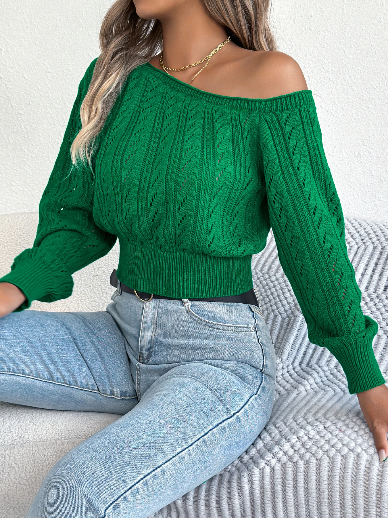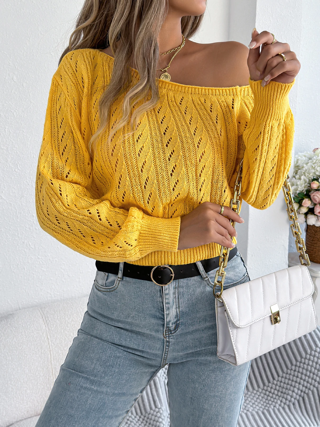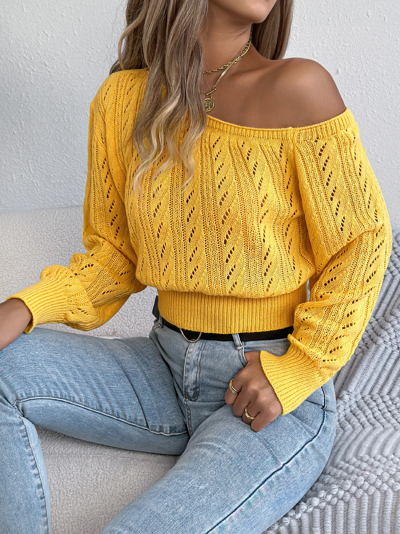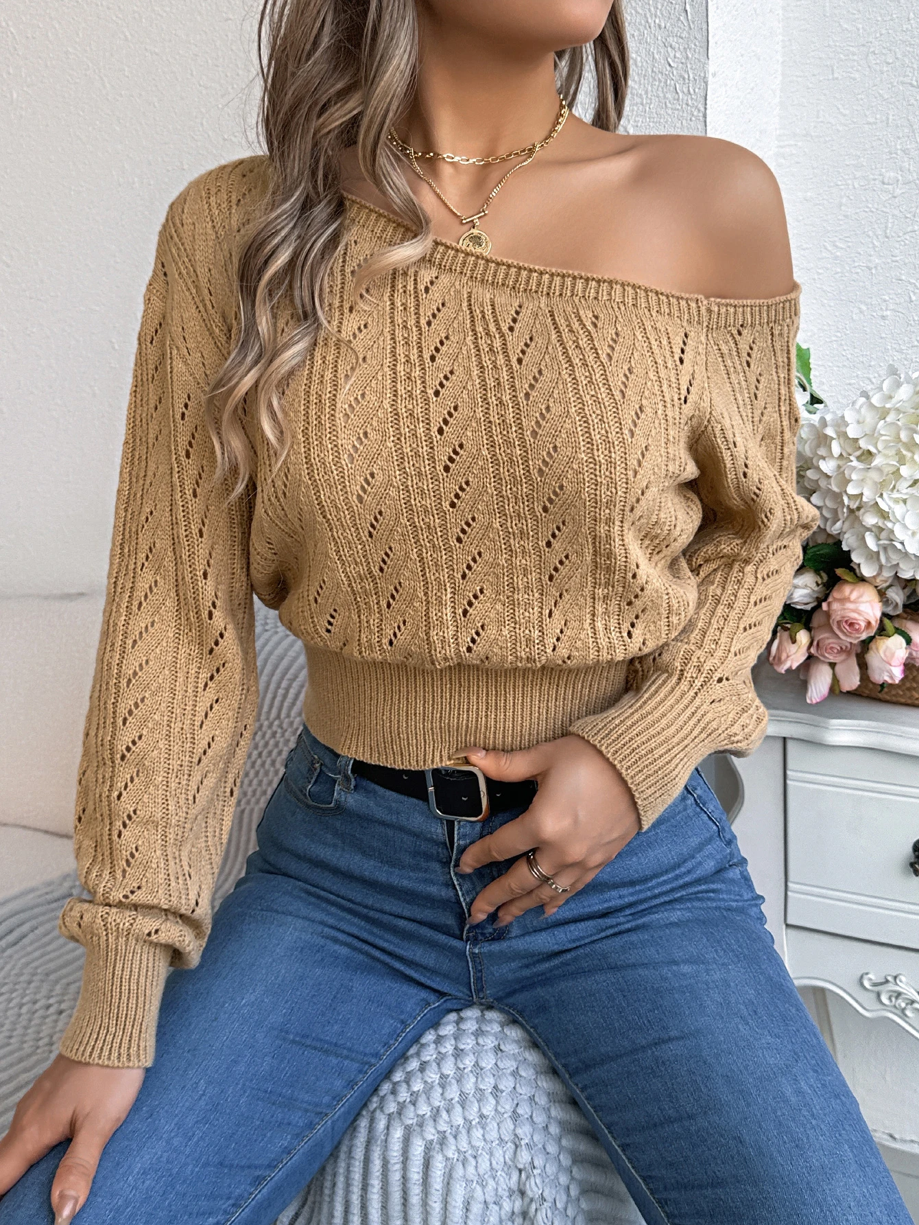 Wrap yourself in warmth and understated elegance with this off-shoulder hollow-knit sweater. Designed for women who love subtle allure, its soft, breathable fabric keeps you cozy during crisp autumn and winter days. The off-shoulder design adds a touch of feminine charm, while hollow long sleeves give it a delicate, fashion-forward feel. Versatile and effortless, pair it with jeans or a chic skirt for relaxed, stylish, hygge-inspired seasonal vibes.